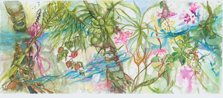 Kerstin Mempel, Marias Garten (Costa Rica), Aquarell auf Leinwand, ca. 50 x 150 cm